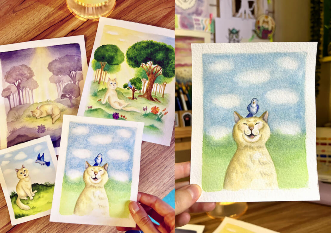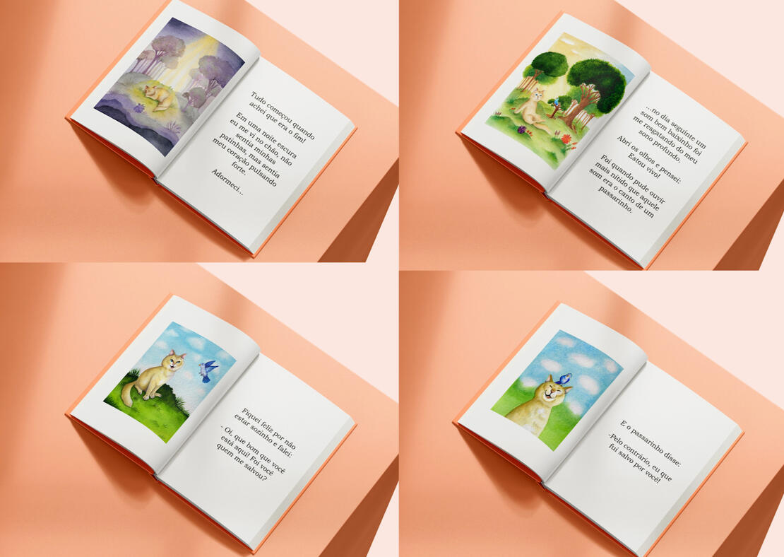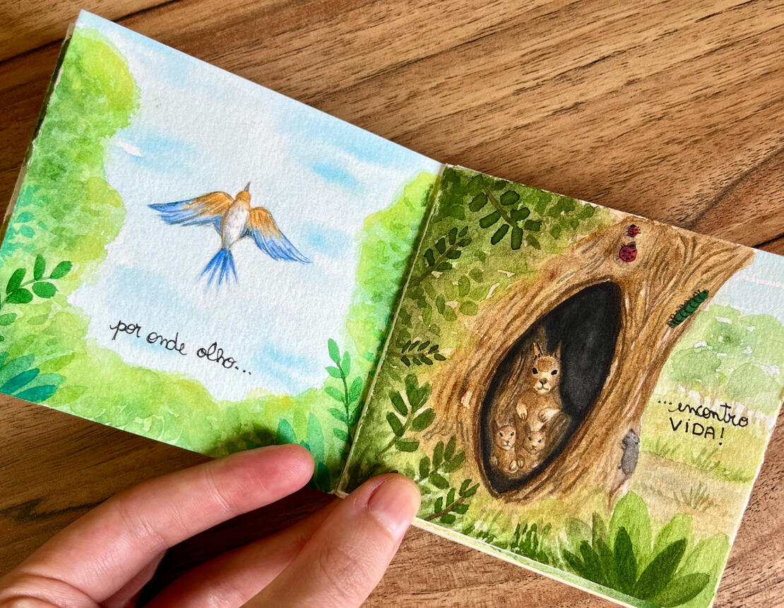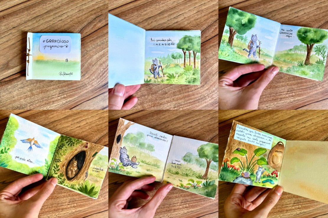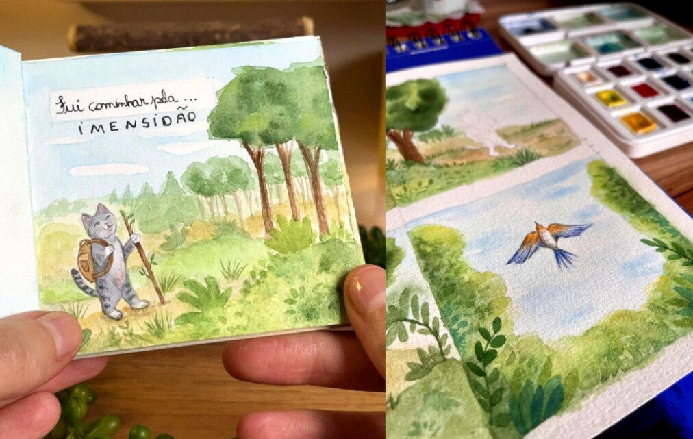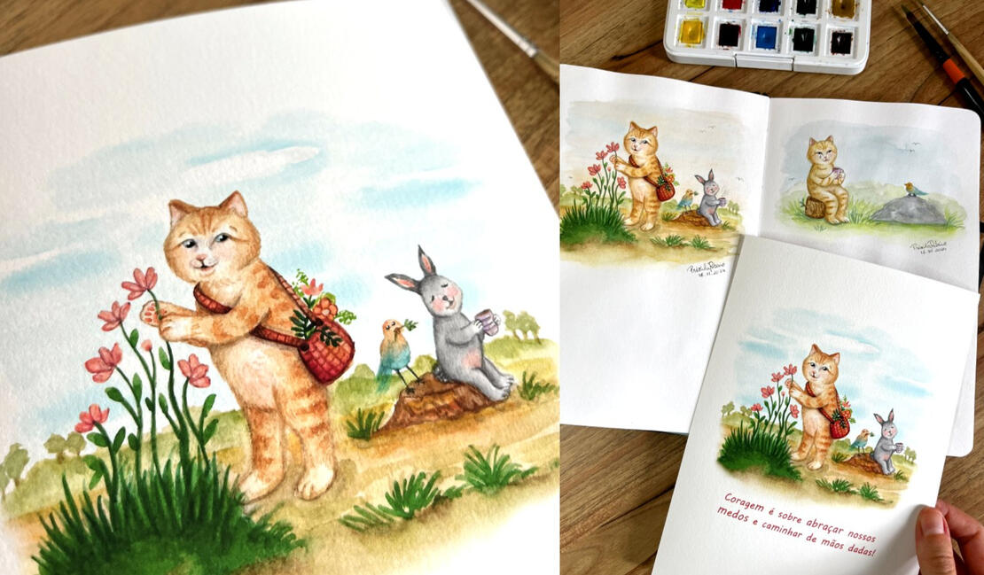 Série de cenas curtas em aquarela iniciada em 2024. O protagonista é um gatinho amarelo, ele e seus amigos da floresta conversam sobre temas que nos fazem refletir sobre nossos sentimentos. Trabalho em desenvolvimento.