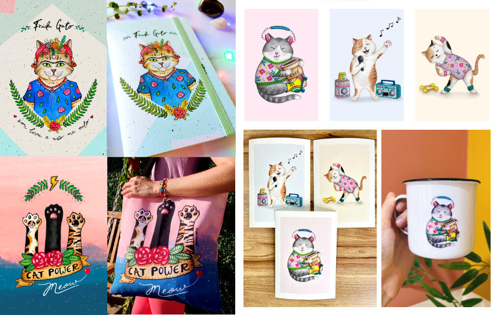 Ilustrações Pop Art voltadas para aplicações em produtos. Nesse estilo o tema principal é o mundo felino ou de Pets. Há presença de uma paleta vibrante e colorida, técnicas mistas que vão de aquarela, nanquim, lápis de cor. Artes feitas entre 2021 à 2024.